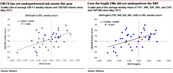 Equally striking, he adds, is that EM FX moves have no longer underperformed risk assets, with the weakness observed in EM assets having instead been consistent with moves in global risk assets – from S&P 500 to USDJPY – rather than showing any clear evidence of underperformance and EM-specific tension.