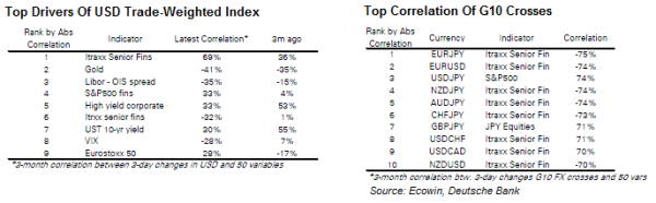 The upshot of these changing correlations, he concludes, might still be to maintain a net long USD/EM position over the coming couple of months, but at the same time to take advantage of elevated implied volatility, which looks too high for a non-crisis adjustment by selling dollar calls against EM.