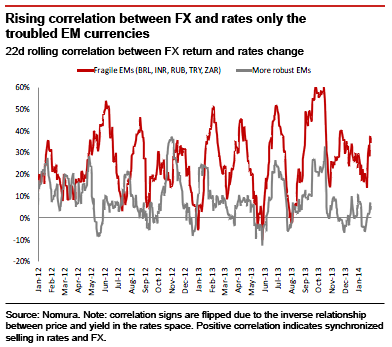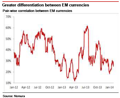 So far this year, even during the mini blow-up in EMs, intra-EM FX correlations are quite low, says Jens Nordvig, managing director of currency research at Nomura Securities International, in New York. This signals that investors are still, to some degree, differentiating between the individual currencies – a healthy sign relative to indiscriminate selling, such as that observed in June 2013.