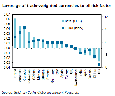 Unsurprisingly, he adds, the trade-weighted currencies that strengthen the most when the oil price rises are the Canadian dollar, Australian dollar and Brazilian real, joined by South Africa and Indonesia, whilst the currencies that weaken the most are the US dollar, Chinese yuan, Indian rupee and Japanese yen.