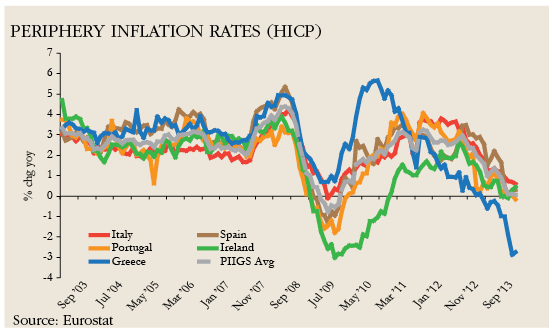 So where is the escape valve? It is the euro exchange rate. A cheaper currency would help address that and help with the peripherals’ competitiveness. That’s the only way to avoid the consequences of a deflationary Europe in 2014.