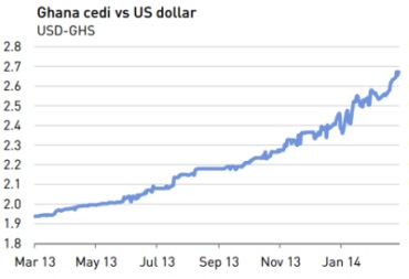 But even with a short respite brought on as a result of the policy changes, the cedi has continued to spiral out of control: year to date, it has fallen 8.2% against the dollar; over the past 12 months, it has fallen 33.6%. In 2013, the cedi was the worst-performing currency in sub-Saharan Africa after the South African rand. Policy changes have done little to change the cedi’s fate – so far.