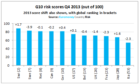 Europe’s debt problems continued to negatively affect the G10 grouping of leading industrialized nations last year. Whereas Germany and Switzerland withstood the rising risk trend with their robust fiscal balances, others, including the UK, France and Italy, were all downgraded by experts worried about rising debt burdens and slow or no growth.