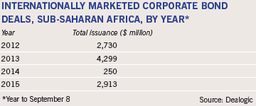 Yet there was good news, even in these darkening hours. While sovereign bond issuance declined over the period, volumes remained higher than those posted in three of the previous five years, according to data from Dealogic. Global issuance by African corporates also showed solid signs of life. Total bond issuance by regional firms topped $2.9 billion in the year to September 2015, against just $250 million in the same period a year ago.