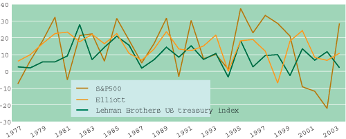 Elliott Associate’s annual returns (1977-2003) cumulative data and comparisons to stock and bond market returns and volatility |