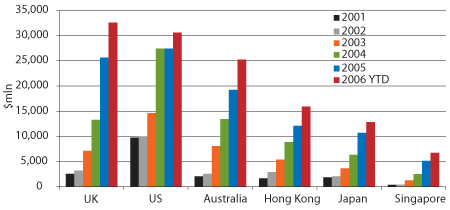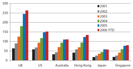 The number of hedge funds with pure Asian strategies increased from 229 in 2001 to more than 800 in August 2006, and assets under management over the same period increased from about $18 billion to $124 billion, according to conservative estimates by hedge fund research firm Eurekahedge. The growing recognition of Asia’s potential is evidenced by the gradual shift in the geographical base of such funds. The number of home-grown funds has increased as Asian fund managers and investment bankers have left financial institutions at home or abroad to start up funds locally. In addition, foreign entrants wishing to get on the Asia hedge fund bandwagon have realized the importance of having a presence on the ground.