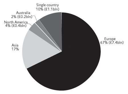 The average target internal rate of return is 12.1%, derived from the various investment styles of the underlying funds being invested in. Of the total target equity of vehicles that indicated their investment strategies in the directory, €3 billion will target core vehicles, €5.3 billion value-added and €2.1 billion will look to invest in opportunity funds. Average total gearing for the underlying funds within the portfolios is 56.5% but additional leverage at the fund of funds level was only reported in six vehicles in the directory.