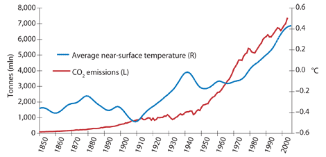 Global CO2 emissions from fossil-fuel burning and smoothed average near-surface temperature – difference compared to the 1961-90 average |