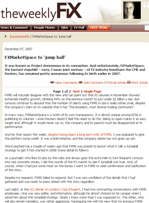 FXMarketSpace (FXMS) announced a fresh initiative to try to attract some liquidity on to its screens when it unveiled its so-called JumpBall strategy. The JumpBall scheme intends to reward institutions that deal on the platform. FXMS says it is open to bank and non-bank participants and that it will reward the 16 most active traders from January 15 2008 until September 30. Those who qualify will then receive a share of FXMS’s profits for up to four years.