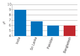 Does Bangladesh have a chance to join that club? “I think it has,” says Mirza. “For one thing labour costs in Bangladesh have remained low. On the human resources side, even if the percentage of people coming out of [top] schools is not all that high, the absolute number is quite large. Third, our private sector has become a lot more dynamic now. And young entrepreneurs are emerging, mostly sons and daughters of established businessmen who have been educated abroad, come back home and tried to make their enterprises more professionally managed. Farmers are learning to switch crops, adopt new seeds and use greater irrigation.”