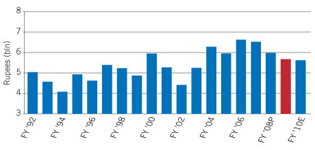 While that keeps the wolf from the door at an individual level, it’s an inevitable drag on an economy that wants to grow. The fiscal budget in June doubled subsidies for fertilizers, petroleum and rice, although some pass-through prices have been adjusted since; these subsidies accounted for 14% of the total budget, or 2.3% of GDP. “A substantial amount,” Mirza says. Citi economist Anushka Shah in Mumbai puts subsidies at 38% of total government expenditure, and estimates they will be 12.5% higher in the 2009 financial year budget than in 2008’s.