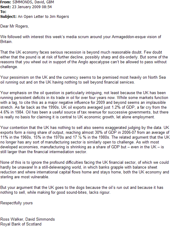 The Royal Bank of Scotland’s David Simmonds (its head of FX and emerging markets strategy) and Ross Walker (its UK economist) were also baffled and felt moved to write an open letter to Rogers that articulated their opinions far more intelligently and eloquently than my mini-rant.