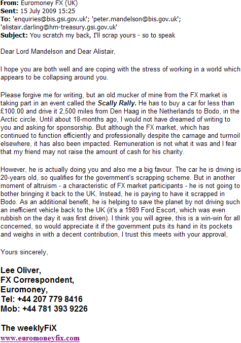 As he is going to leave the car in Norway, I thought Jouhar should tap Alistair Darling and Peter Mandelson for the £2,000 scrappage the UK taxpayer will save, so I wrote to the government on his behalf.