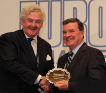 ![]() Padraic Fallon, chairman of Euromoney Institutional Investor plc, presents award to Jim Flaherty of Canada at a reception on October 6 in Istanbul during the annual World Bank/IMF meetings. |