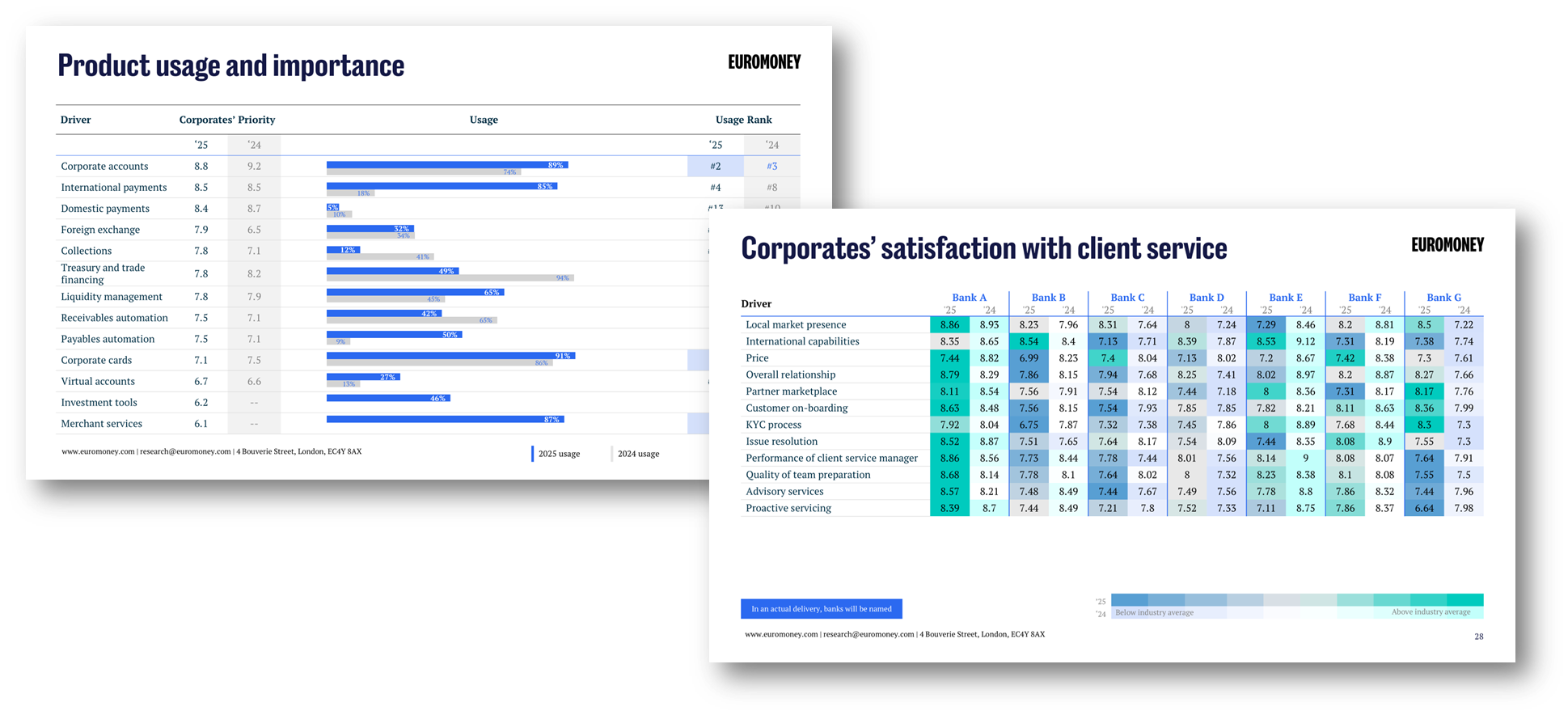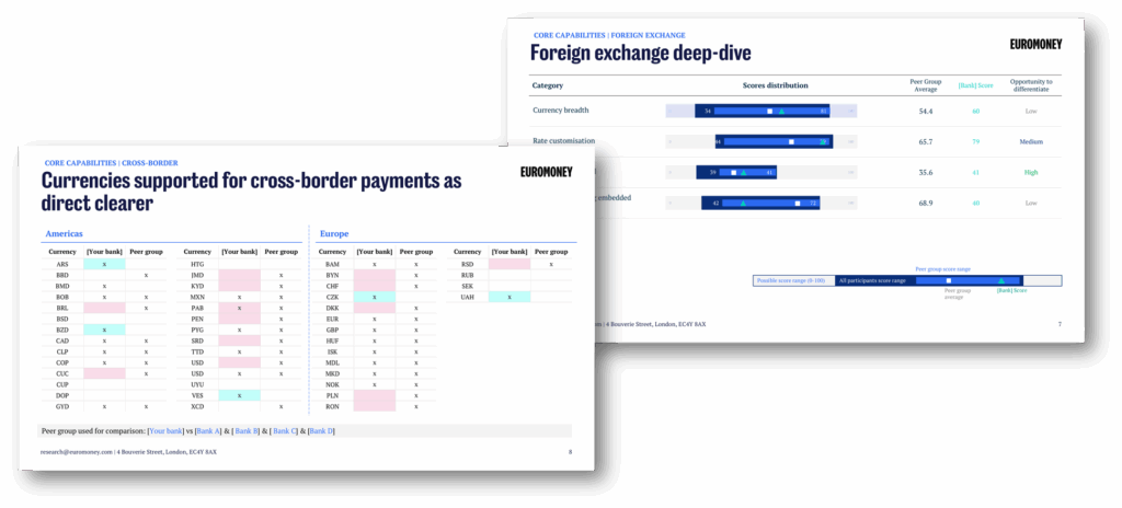 - Bespoke benchmarking using Euromoney’s client survey data (45,000+ responses across cash mgmt., trade finance and financial institutions)